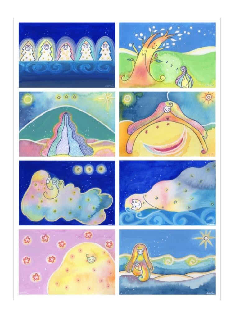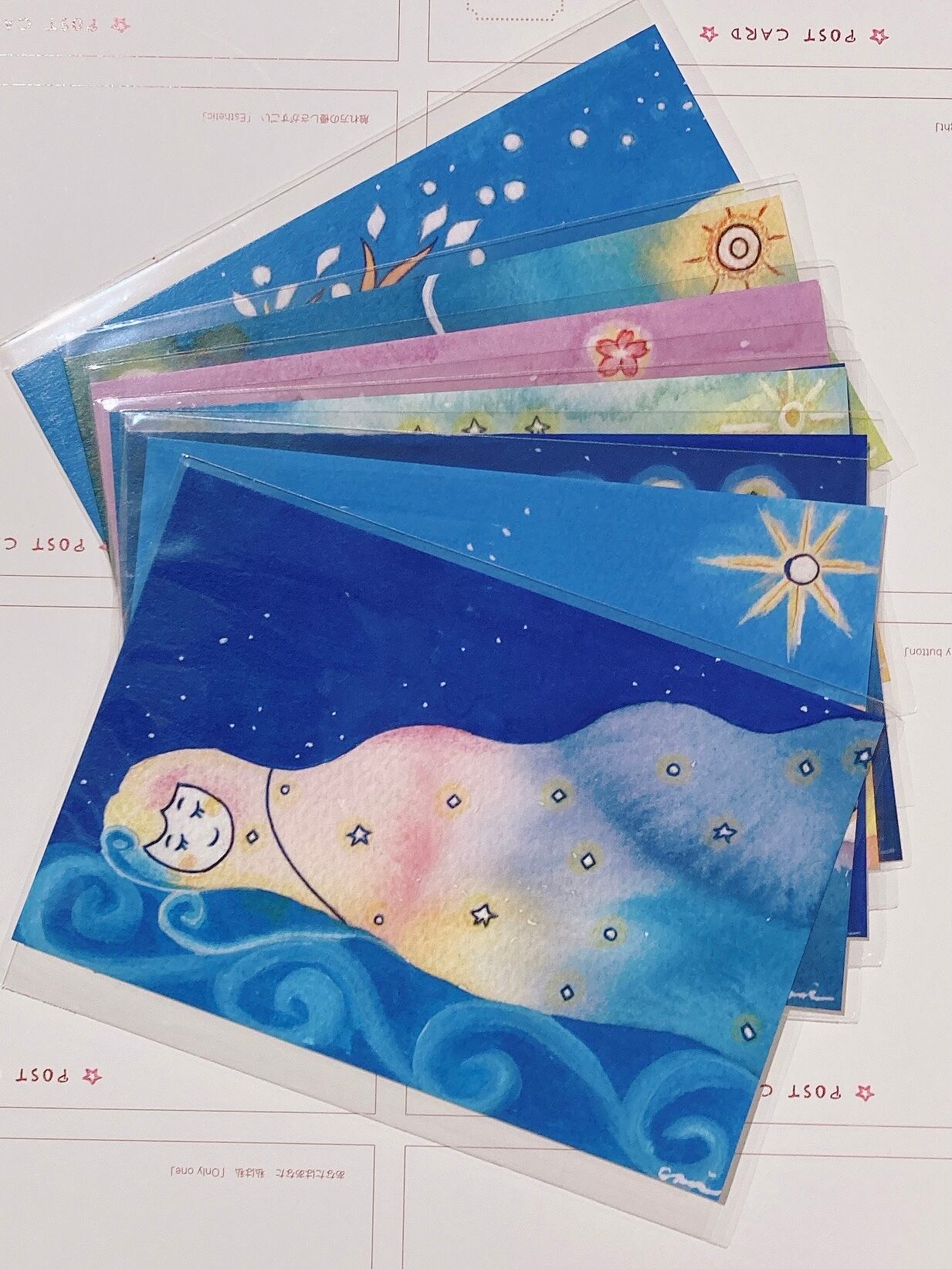 やや艶のある紙質で、鮮やかなアクリルで描いています。